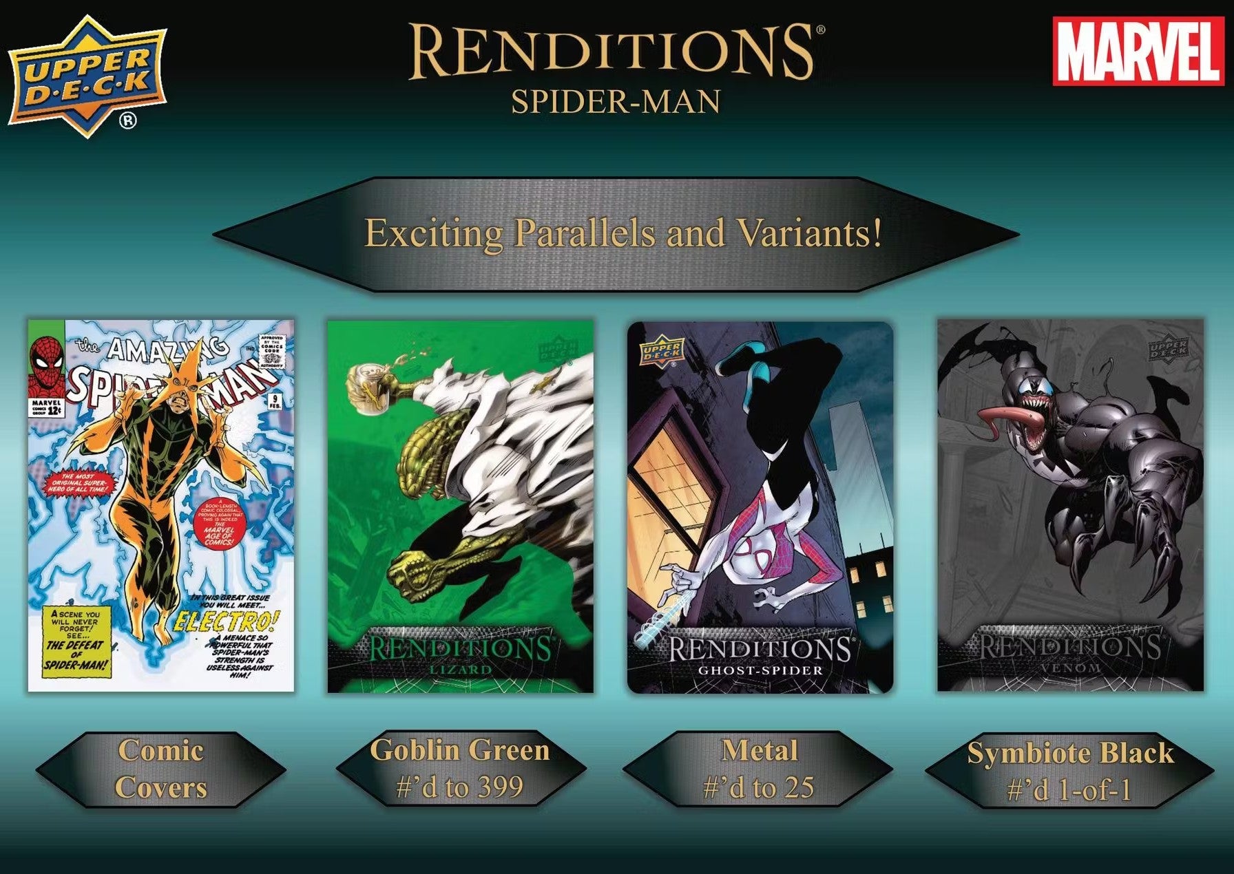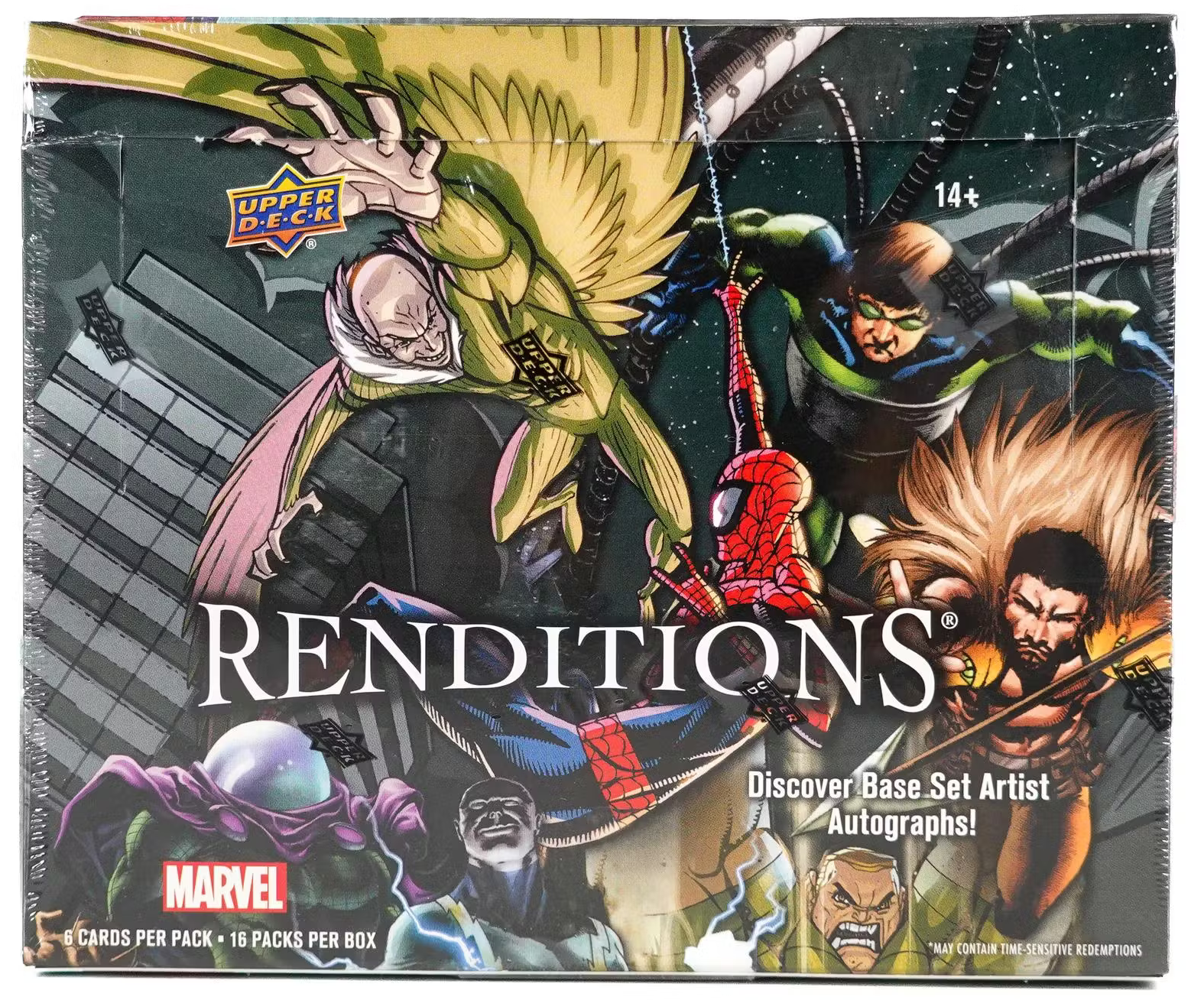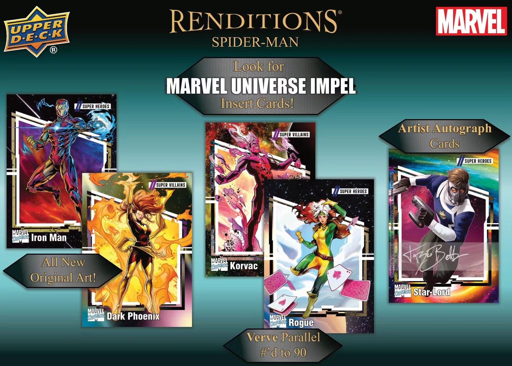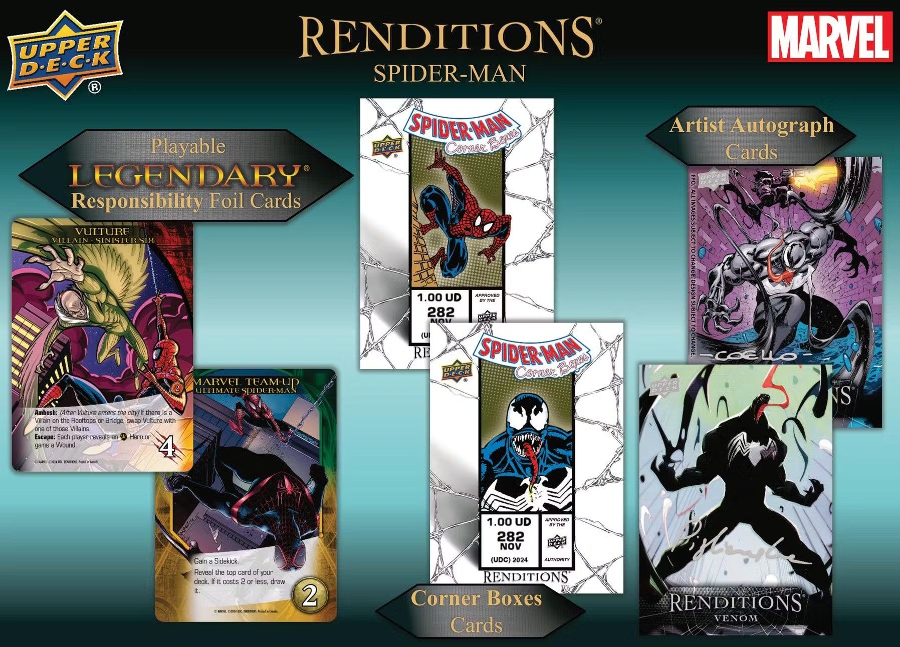 Marvel Renditions Spider-Man unites the original art of Legendary Marvel Deck Building Game with all-new Marvel Universe Impel cards and more! Collect Spider-Man and his allies and adversaries across unique inserts!