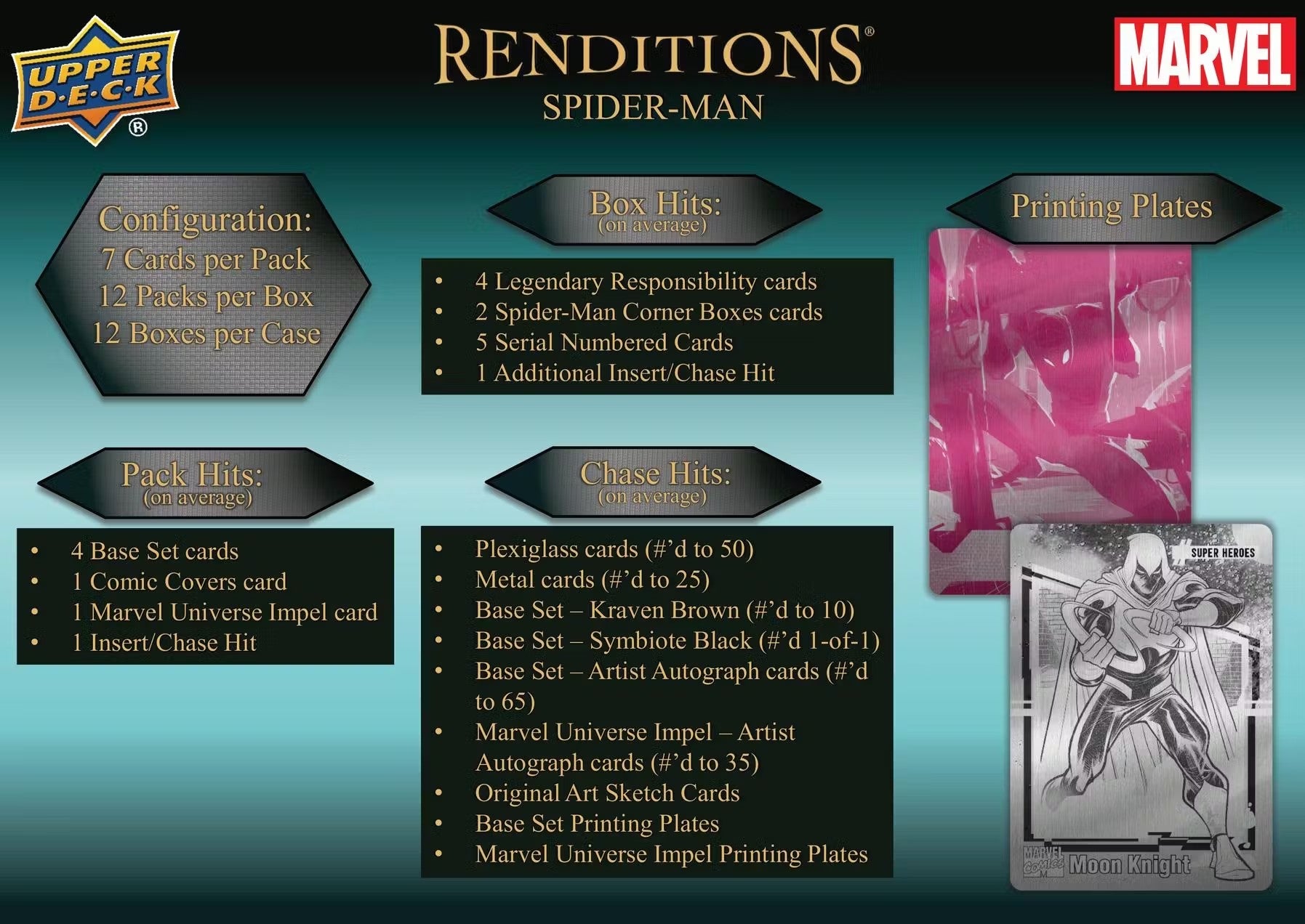 Every Box contains Four Legendary Responsibility Cards, Two Spider-Man Corner Boxes, Five Serial Numbered Cards & One Additional Insert/Chase Hit!